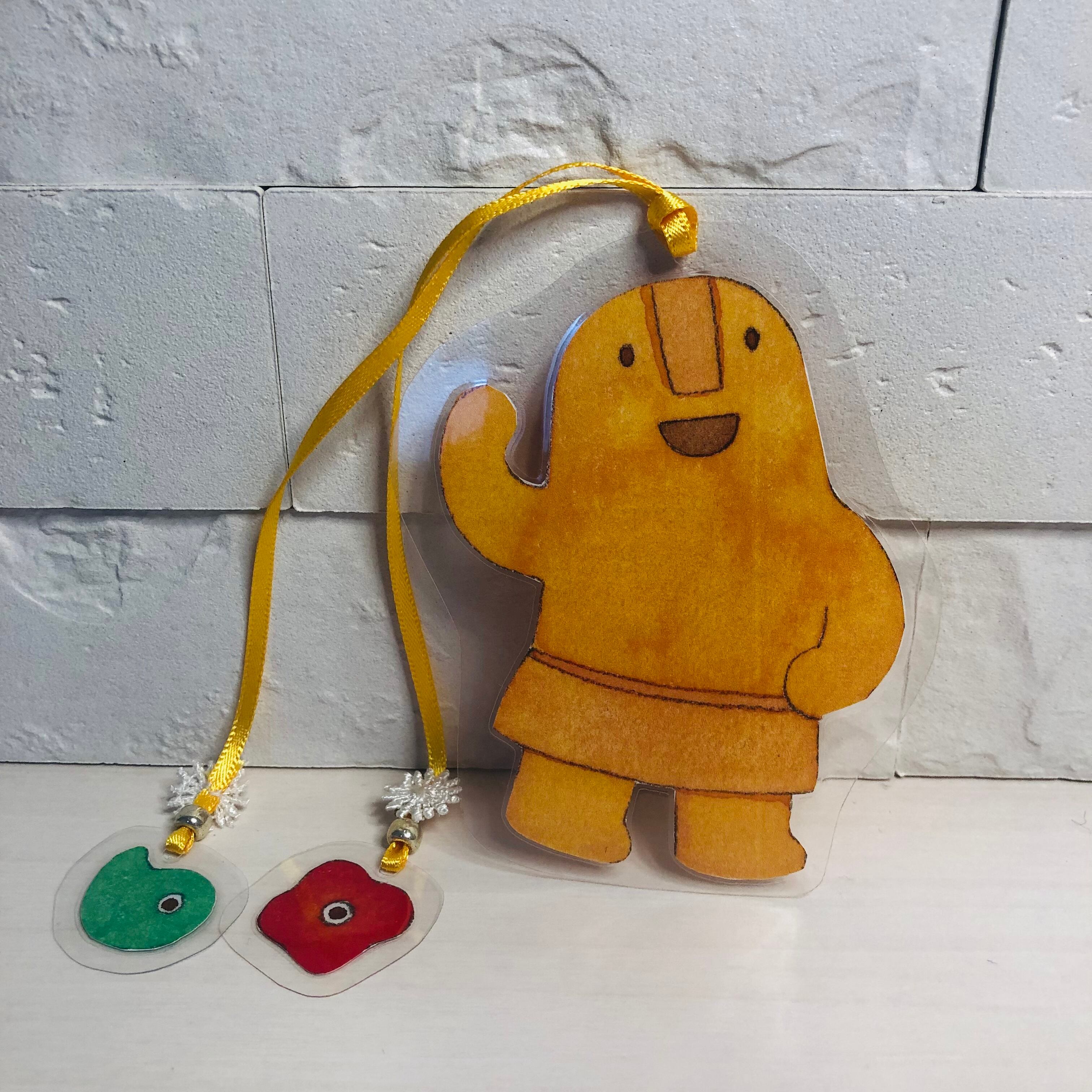 イラスト部分はラミネート加工を施しています。サテンリボンの端には花と勾玉イラスト、